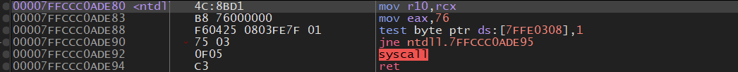 Por ejemplo, la función NtAllocateVirtualMemoryEx de la ntdll.dll ejecuta la Syscall con el número 0x76.